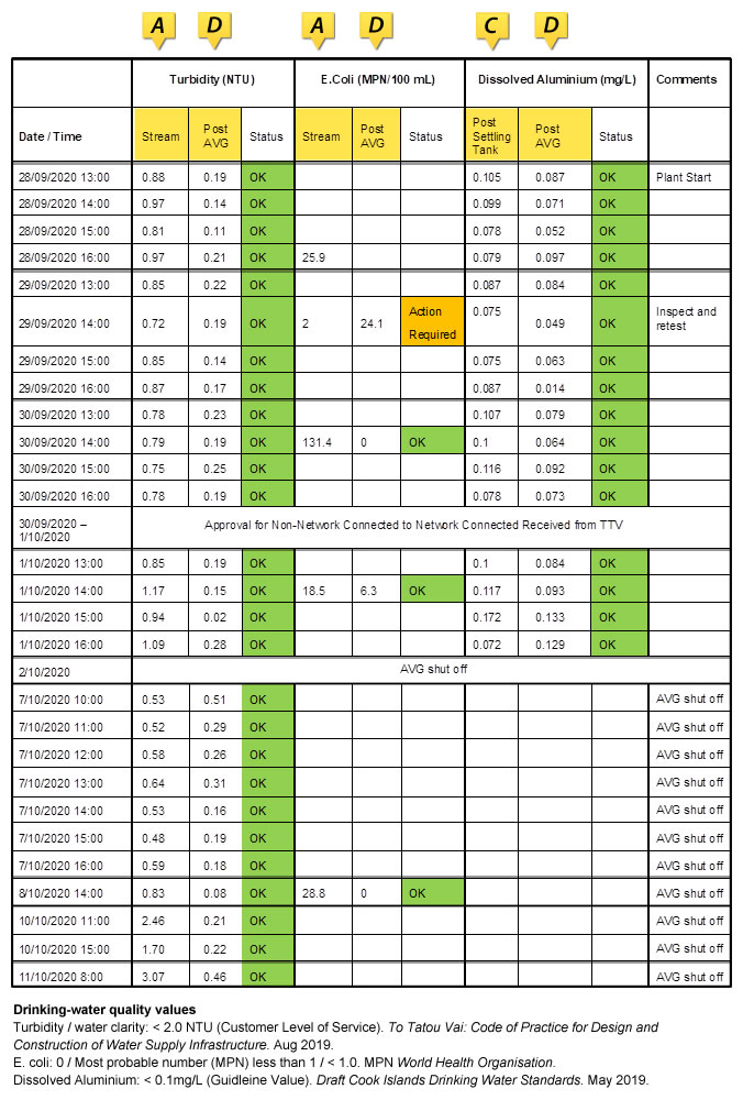 The Ngatoe results show that trial data was collected for three days, Sept 28-30 2020. Approval was then obtained from To Tatou Vai and water released to the ‘Network system’ — the public water supply. The Te Mato Vai system was on-line from 1 Oct 2020. For the remaining five-plus months, chemicals will be used in a live environment.