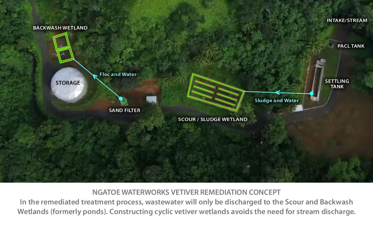 Above:Te Mato Vai: Vetiver Cylic Wetland Concept (Ngatoe) In the remediated treatment process, the risk of stream discharge will be buffered by enhancing the function of the storage ponds.
