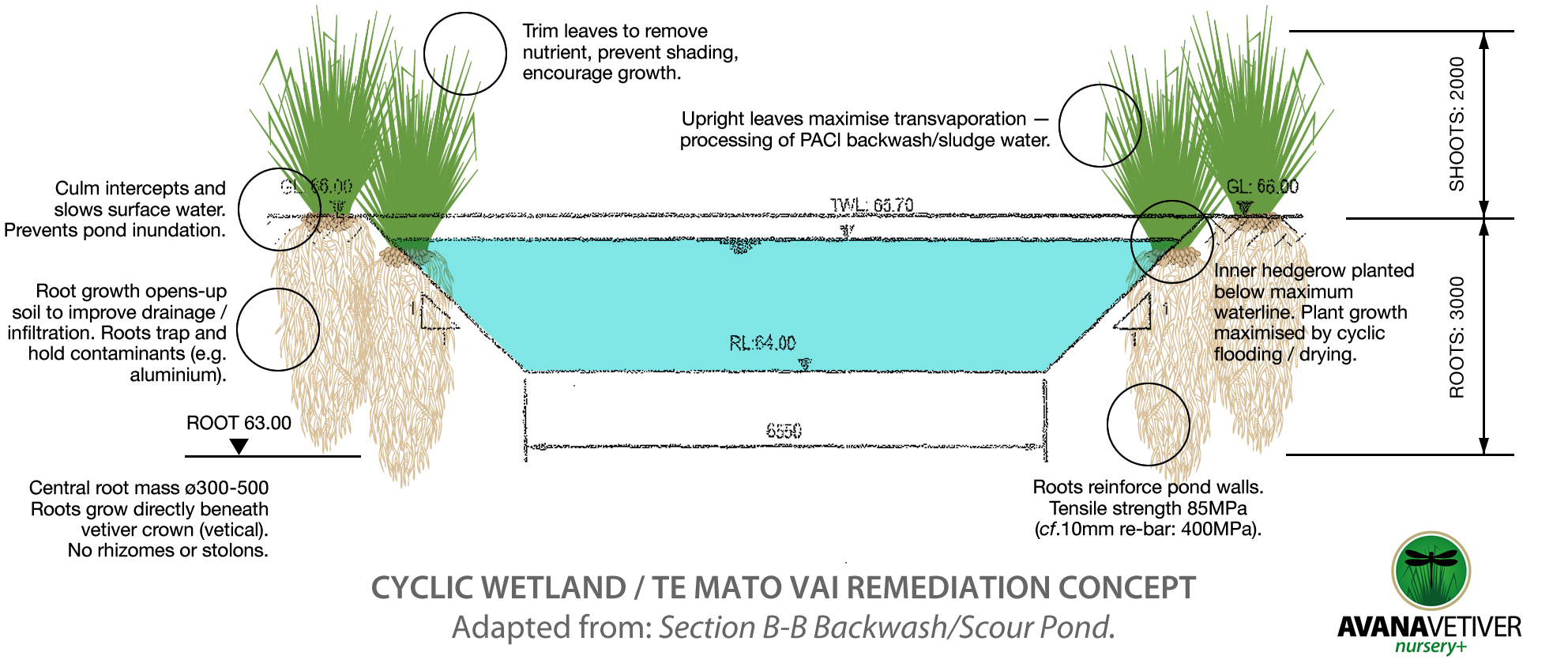 The dense and (3m+) deep root system grows directly downward stablising the sides of the pond, increasing drainage, and reducing the likelihood of overflow. The root system filters out and binds minerals — including aluminium. Microbes living in the soil further purify the water.
